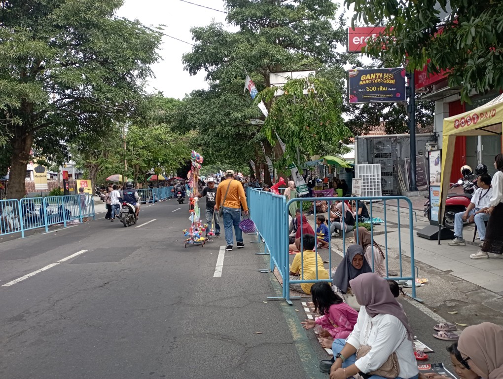 Petugas keamanan dan panitia tampak berjaga di sepanjang jalan, memastikan arus lalu lintas tetap tertib dan penonton tetap berada di area yang telah disediakan. Pedagang kaki lima pun ikut meramaikan suasana, menjajakan mainan anak-anak hingga makanan ringan.